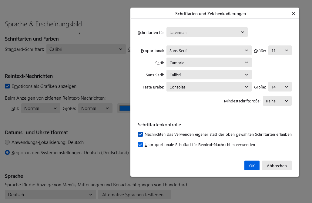 auf meinem neuen Notebook war Windows 11 Pro vorinstalliert. Ich habe den Umzug mit Thunderbird auf den Rechner auch problemlos hingekriegt. Mit Windows 11 komme ich aber überhaupt nicht zurecht, deshalb habe ich heute ein Downgrad auf Windows 10 Pro gemacht. Schon bei Windows 11 hatte ich ständig Probleme mit dem Schriftbild in Mails. Wenn ich einen Text geschrieben habe, war die Schrift ok. Wenn ich auf eine Mail geantwortet habe, war die Schrift in der ursprünglichen Mail total klein und mein eigener Text sah auch nicht viel besser aus. Manchmal ist auch nur der Text über der ursprünglichen Mail "Am ... schrieb ... wie folgt" winzig und der Mailtext normal, ebenso wie mein Antworttext. Wann welche Konstellation auftritt, konnte ich bisher nicht feststellen. Der Text von eingehenden Mails ist normal und wenn ich ohne Antwortfunktion eine Mail schreibe, auch. Ich habe gehofft, das Problem löst sich mit dem Downgrad - tut es aber nicht.