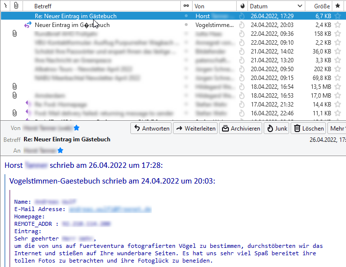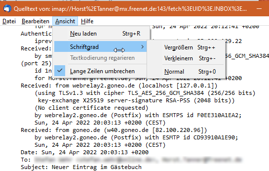 ZitatJe nach Voreinstellung macht der Mailclient daraus irgend etwas passendes. Schalte mal bei der Quelltextansicht die Textkodierung von 'Westlich' auf 'Unicode', dann siehst du vermutlich wieder diese merkwürdigen Zeichen statt der Umlaute.