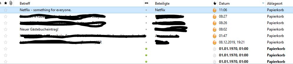 Habe seid kurzem das Problem das ich immer mindestens 6 Mails mit in den Papierkorb bekomme wenn ich den Junkordner lösche und ab und an auch wenn ich normal Mails lösche. Sind immer leere Mails mit DATUM 01,01,1970