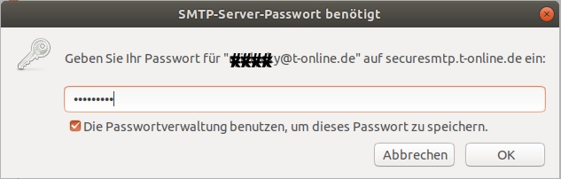 beim VERSENDEN einer Mail muss ich ja auch das Pw eingeben. Ich habe 'versuchsweise' die Option "Die Passwortverwaltung benutzen, um dieses Passwort zu speichern." eingegeben. Als Antwort kommt die im Screenshot gezeigte Fehlermeldung ". . . Passwort für securesmtp.t-online.de ist nicht verfügbar . . ." Hat jemand bitte noch einen Tipp? Danke. EsWeA