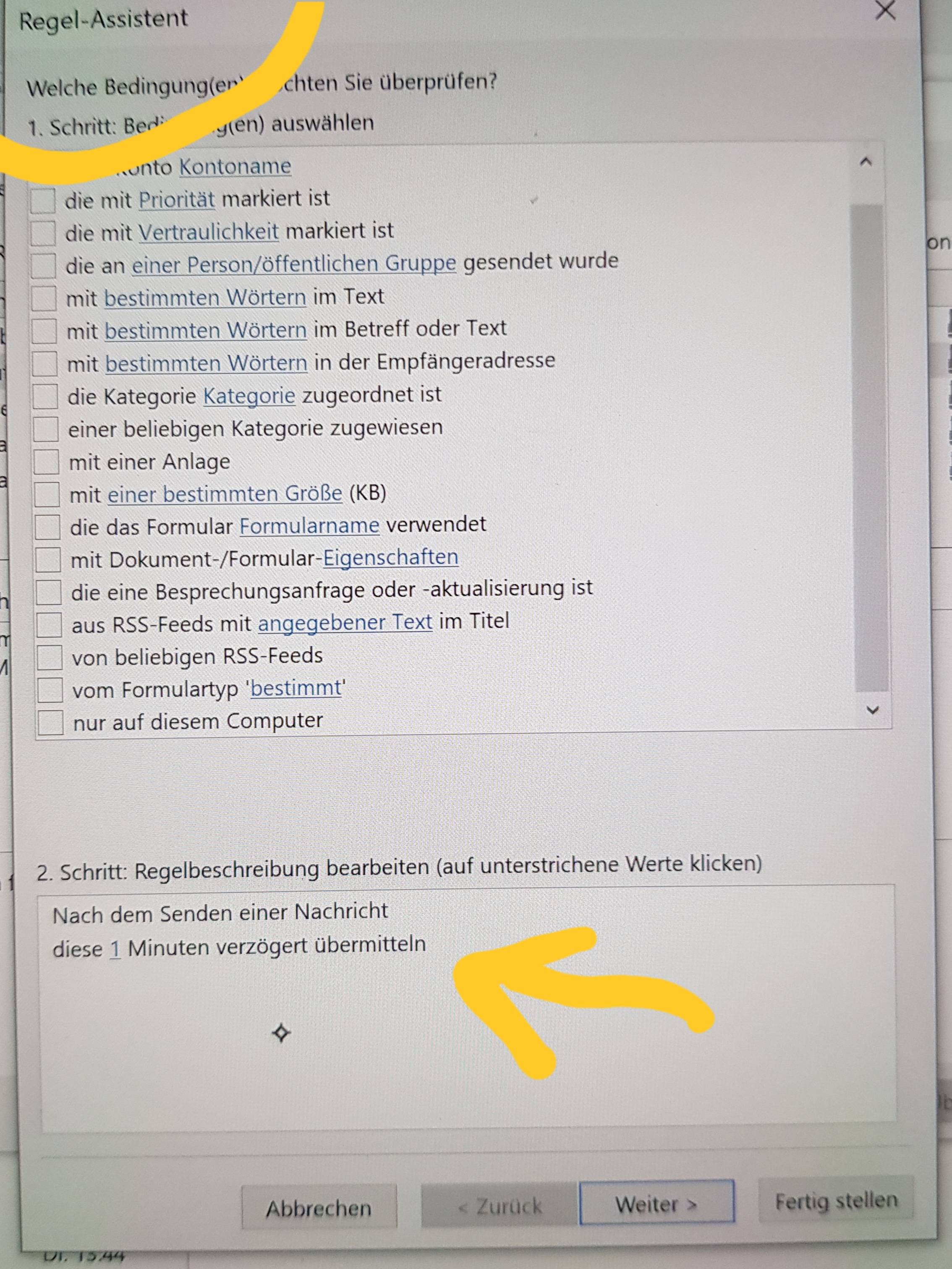 Jede ausgehende Nachricht 1 Minute verzögert senden, ohne dass ein Zwischenschritt notwendig ist.