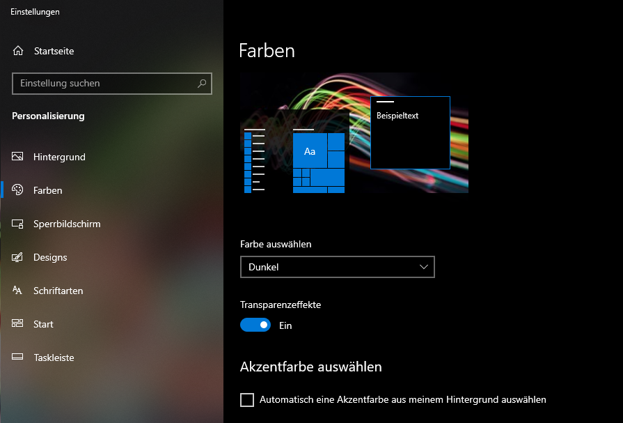 - Unter Windows 10 habe ich das sogenannte "Dark Theme" aktiviert (für Windows und für alle Apps)