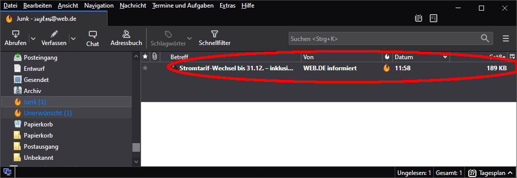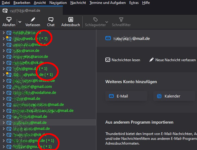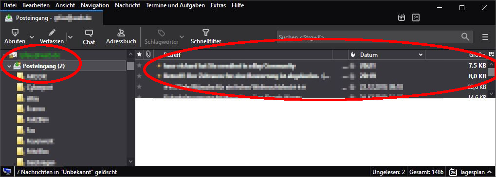 Offensichtlich gibt es einen Zusammenhang zwischen dem dargestellten Verzeichnis (Posteingang) welcher sich beim "anfassen" umgehend fett-weiß darstellt und den ungelesen Mails welche ebenfalls nur noch fett-weiß dargestellt werden.