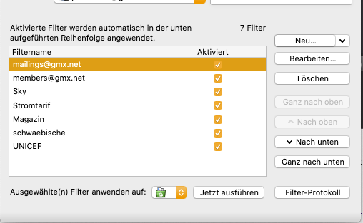 Hallo. Leider wurden mir eure letzten Antworten nicht weitergeleitet. Also ich habe mehrere GMX-Mail-Adressen (für unterschiedliche Zwecke, weil dies so nötig ist) und alle sind gratis. Man kann nichts von dem genannten abbestellen. Ich bekomme ständig Werbung VON GMX für Stromtarife, UNICEF, Magazin (auch nur Werbung, die kein Mensch will), Sky, Update (auch nur Werbung), LTE-Tarife....usw. Anbei zwei weitere Screenshots meiner jetzigen Einstellungen. Heute kam trotz Filter für "Magazin" doch wieder Werbung als "GMX Magazin" in der für Sky geworben wird. Könnte man beim Gratis-Konto bei Protonmail mit Thunderbird Mails abrufen, würde ich bei GMX alles löschen. Protonmail ist nämlich super und übrigens auch Proton VPN. Ich danke Euch.