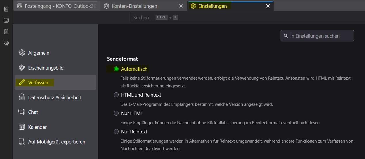 Hier empfiehlt sich "Automatisch" - es sei denn, man will immer "Reintext" versenden.