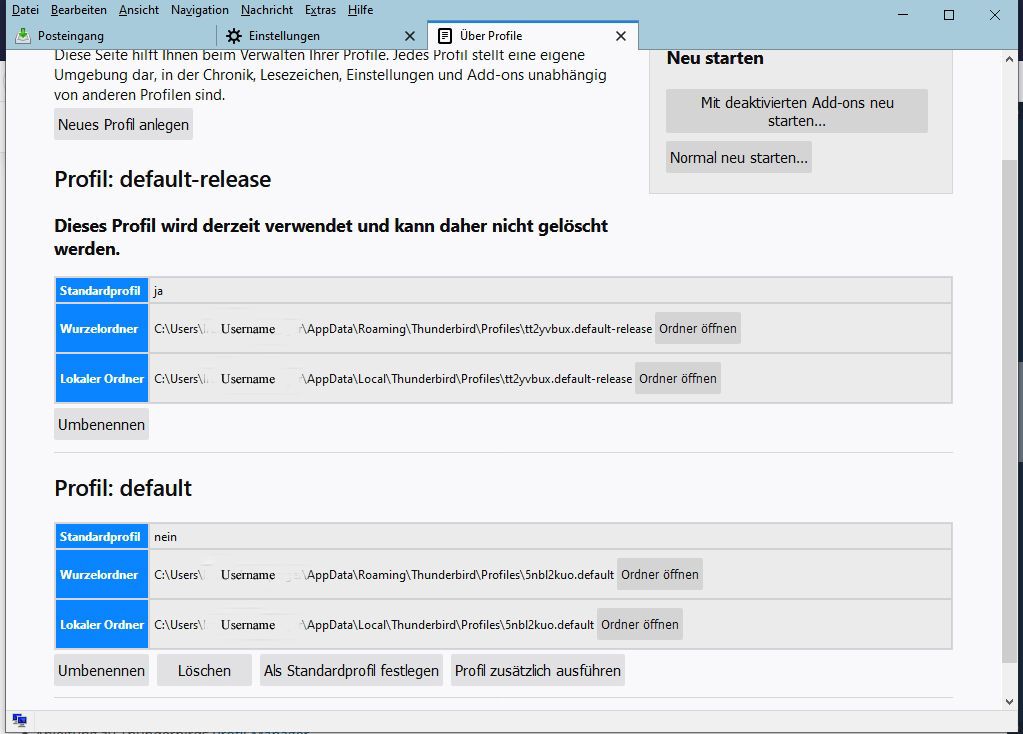 Ich sehe nur eine profiles.ini", und zwar in "C:\Users\Username\AppData\Roaming\Thunderbird"