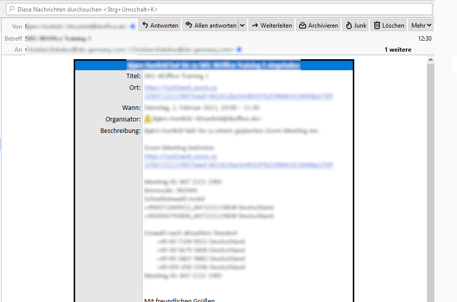 Hallo, ich habe seit - glaube ich - 2 Tagen, das Problem, dass Termineinladungen, die ich erhalte zwar alle Informationen zeigen/beinhalten aber die "Knöpfe" was dann mit der Einladung gemacht werden soll: Annehmen oder Ablehnen, sind nicht mehr da.