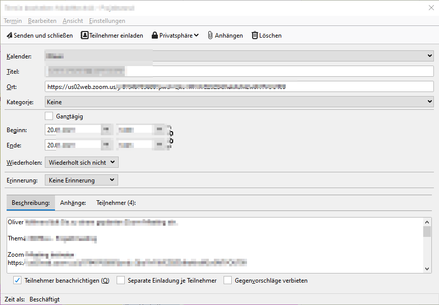 Das geht aber nur in einem Fall: Wenn ich zu einem EINZELTERMIN eingeladen werden und diesen bestätige kann ich später mit Doppelklick folgendes Fenster aufrufen: