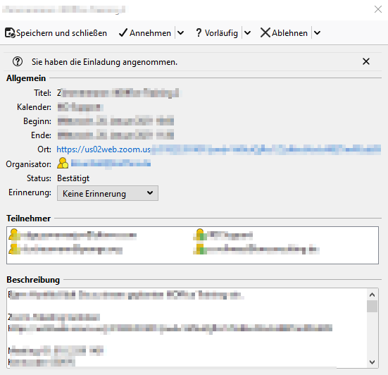 Dann habe ich mich "erinnert", dass ich auf dem Laptop auch einen Thunderbird installiert habe, den ich vielleicht 1xWoche aufmache. Also aufgemacht und dort, siehe da: Die Buttons sind da wie gewohnt. Erstmal schnell alle Termin bestätigt bzw. bearbeitet, damit ich keine Handarbeit machen muss.