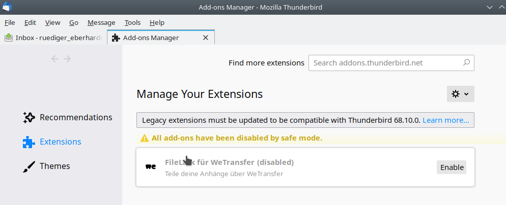 Als add-on habe ich „FileLink für WeTransfer“ installiert, aber gleich nach der Migration disabled. Thunderbird hat FileLink auf die Version 2.0.0 mit update 1.7.2020 gebracht.