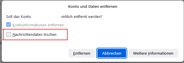 Hinweis: Der Screenshot wurde aus meinem Thunderbird erstellt und hier ist die Option klickbar, Ich habe leider keinen Screenshot vom PC mit dem Problem. Aber der Screen zeigt die Stelle im Konto entfernen Dialog der nicht klick bar ist.