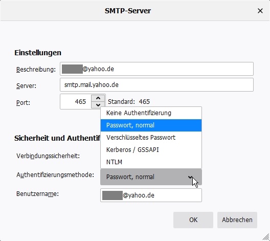 Interessanterweise erscheint beim Versuch, den SMTP-Server zu bearbeiten, die Authentifizierungsmethode "OAuth2" überhaupt nicht: