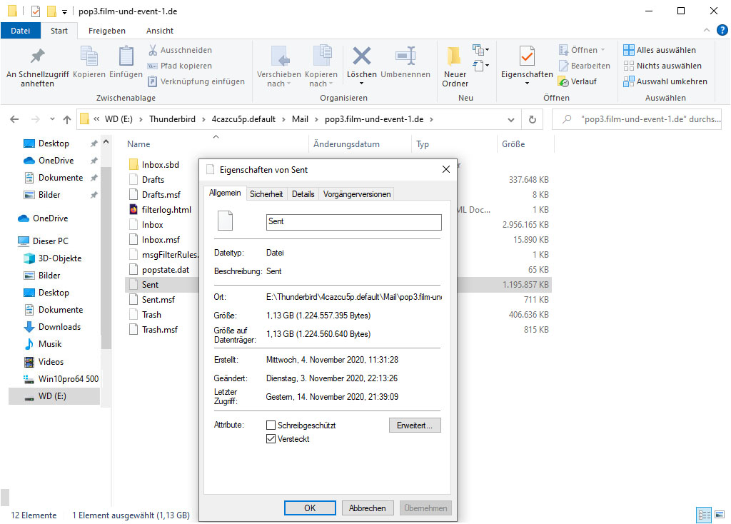 Zunächst habe ich den Vorschlag befolgt, und die Datei mit den alten Mails in Local Folders gepackt und in ..._alt umbenannt. Die .msf Datei habe ich dabei nicht berücksichtigt. Leider erfolglos, die alten Mails waren auch in den Local Folders nicht zu sehen. Dann habe ich mir die Datei "Inbox" hinsichtlich Atribute und Freigabe mal genauer angeschaut. Dabei viel mir auf, dass die Datei als "vesteckt" markiert war. Das habe ich dann mal weg geklickt und schon war der Ordner mit allen Mails sichtbar. Gleiches für die gesendeten Mails, sowie für die Mails des anderen Kontos.