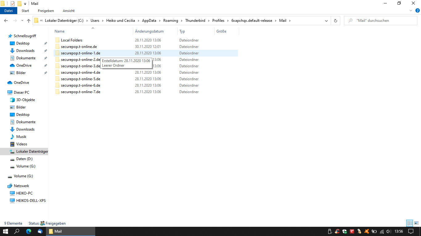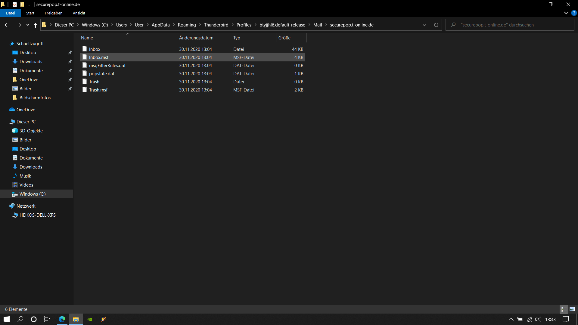 Nr.5 TB 68.12.1 nach Installation von und dem Einfügen des Profiles vom Quellrechner. Wie man sieht, keine einzige Mail mehr drin und das gesamte lokale Verzeichnis ist weg