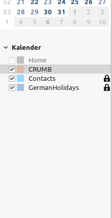 Den Kalender-Tab öffnen und mit der Maus auf das zu ändernde Element klicken. Der Selektor des entsprechenden Elements wird im linken Feld des Werkzeugkastens blau markiert. Wenn man dann die Maus auf die blau markierten Zeilen bewegt, wird das Element (der Kalender CRUMB) rot gestrichelt umrandet :