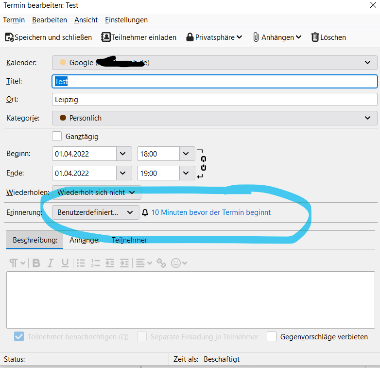 Nach dem Speichern aber steht da Erinnerung 10 Min vor Beginn.