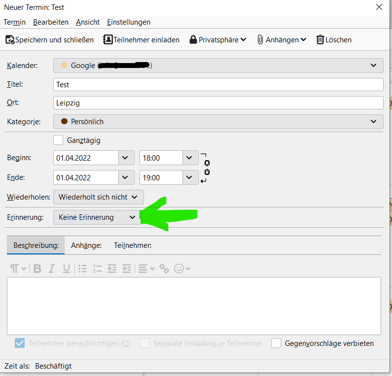 Beim Anlegen eines Termines im Kalender (Googel) möchte ich keine Erinnerung angeben. Dazu öffne ich einen Neuen Termin. Da ist Erinnerung nicht anggeben.