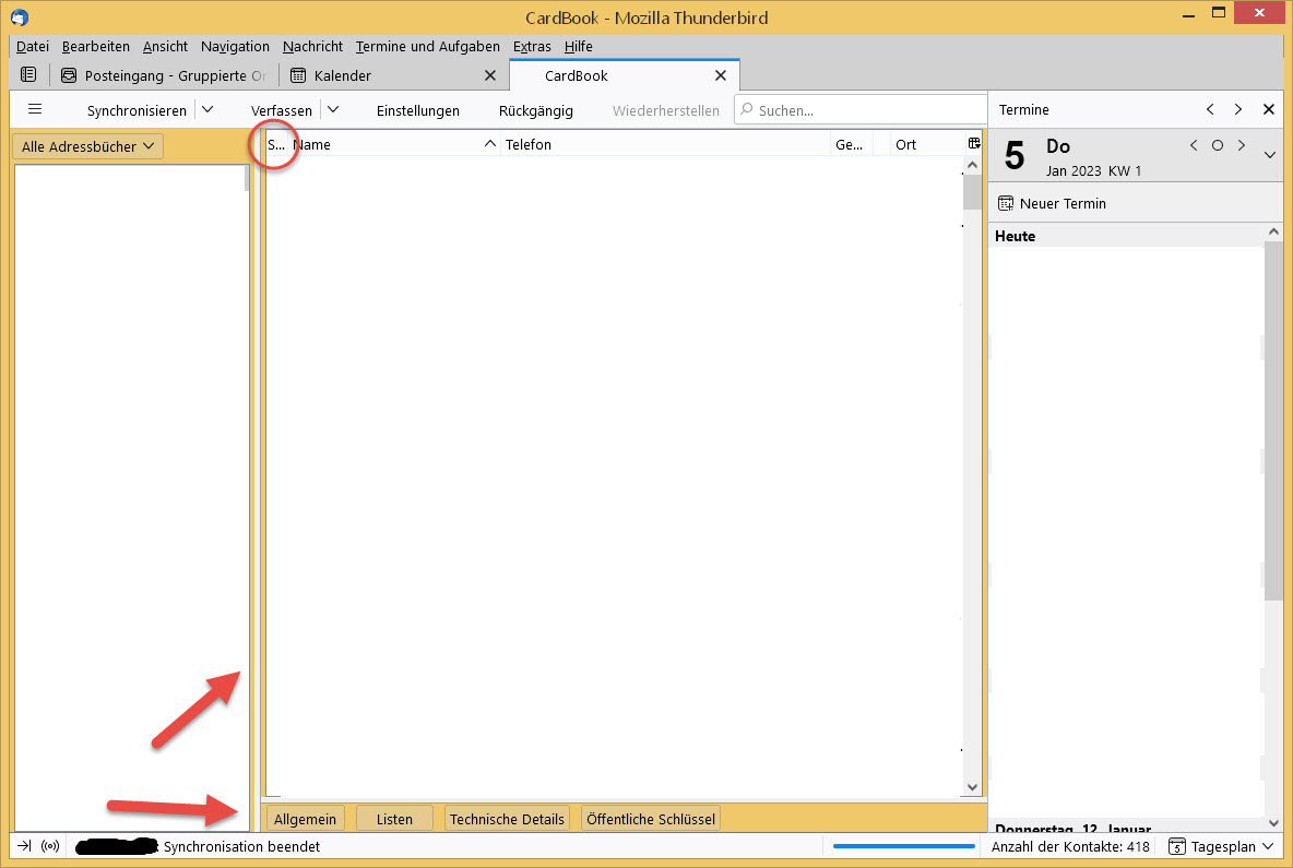 2) Unabhängig davon (?) ist der Bildaufbau von Cardbook (upgedated von v77.0 auf 83.6) auch manchmal unvollständig: Es erscheint kein Symbol in der ersten Spalte, also das "Mensch-Ärgere-Dich-Nicht-Männchen", stattdessen steht dort "S..." und weiterhin bleiben dicke Ränder bestehen, die bunt eingefärbt sind.