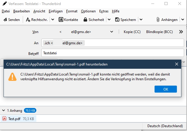 C:\Users\Fritz\AppData\Local\Temp\nsmail.pdf konnte nicht geöffnet werden, weil die damit verknüpfte Hilfsanwendung nicht existiert. Ändern Sie die Verknüpfung in Ihren Einstellungen.