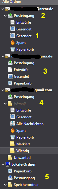 So ist zum Beispiel unter (1) der Ordner „Gesendet“ zweimal vorhanden. Im „Lokale Ordner“ brauche ich keinen „Postausgang“ (5). Wie kann ich diese Ordner löschen?