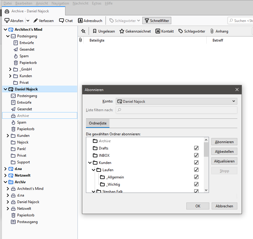 Mir ist heute aufgefallen, dass meine Archive nicht mehr in Thunderbird angezeigt werden. Thunderbird liegt bei mir auf C:\, die Archive separat als eigener Ordner auf D:\ - dort sind die .sbd-Ordner auch noch alle vorhanden.