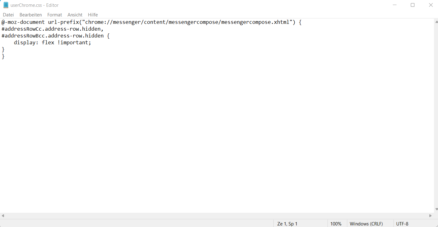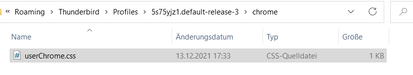 8. Den Unterordner chrome samt Textdatei habe ich erstellt und in diesen Pfad eingefügt: C:\Users\xxx\AppData\Roaming\Thunderbird\Profiles\5s75yjz1.default-release-3