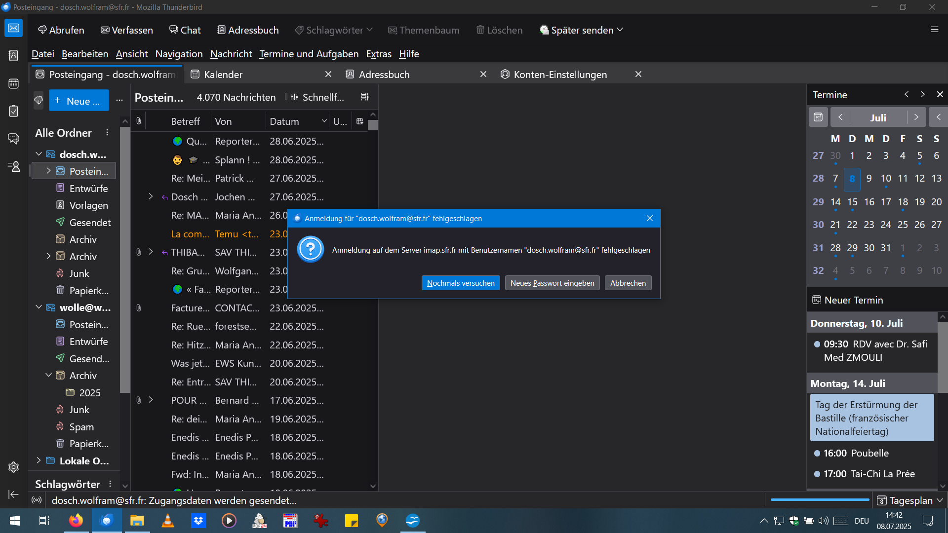 Seit ca 2 Wochen, also noch vor 140.0 von heute auf morgen loggte sich TB nicht mehr auf den französischen Server ein. Mein 2. Mailkonto imap.ionos.de loggt sich ein. Es erscheint ein Fenster, das nach einem neuen PW fragt, nach Eingabe des vorhandenen PW aber es für ungültig erklärt.(Leider kann ich keinen screenshot machen, ich habe keine Anleitung dazu hier gefunden). Das seit vielen Jahren benutzte PW wird ignoriert und nach einem Neuen gefragt. Meine Kontaktaufnahme zu SFR, den franz. Provider war nichtssagend, half mir nicht weiter.