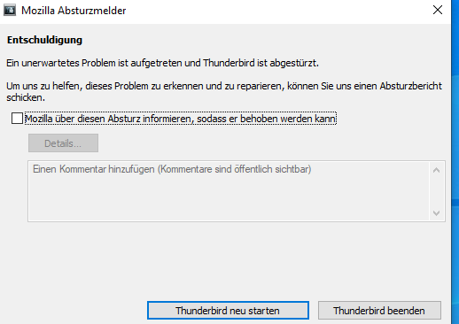 Der Inhalt kann nicht angezeigt werden, da er nicht mehr verfügbar ist. Thunderbird ist plötzlich abgestürzt.Bekomme immer wieder diese Meldung,obwohl ich Meldung abgeschickt habe.Jetzt komme ich nicht mehr in TB rein.In die regedit(zu Suche der crashreporter.exe) möchte ich nicht reingehen,da ein Fehler dort gesamtes Windows beeinrtächtigen kann.Wie ist Abhilfe möglich?