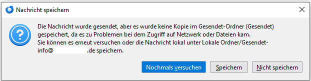 Wenn man eine E-Mail versendet kommt nach 5-10 Minuten die Meldung, dass keine Kopie in gesendete gespeichert werden konnte. (siehe Anhang).
