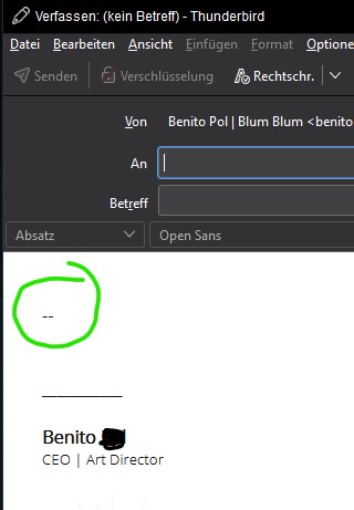 ich verzweifle noch dran... Ich hab immer diese zwei Striche (--) in meiner neu verfassten E-mail mit Signatur, das war auch in allen anderen Versionen so seit Jahren schon. Selbst wenn in der html Signatur nur zahlen stehen mach der das da hin, also liegt es definitiv nicht am Quellcode.