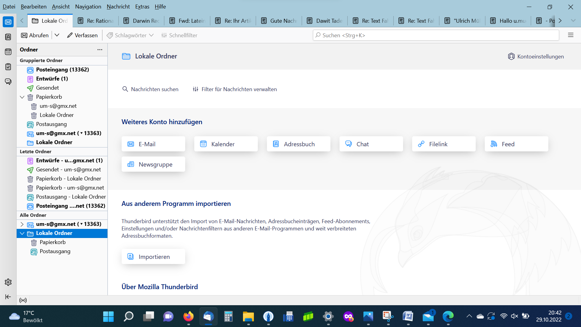 Ok, das leuchtet mir ein. Das Fazit wäre, dass der anfängliche Fehler, dass die Mails nicht abrufbar waren, ein nach wie vor nicht aufgespürter war und ist, und dass er nur durch eben diesen Weg: Aufbau eines neuen Profils und Übernahme wichtiger Ordner, wieder behoben werden kann. Mit TeamViewer bin ich vertraut, das finde ich sehr gut.
