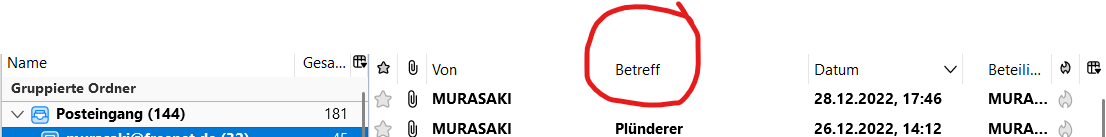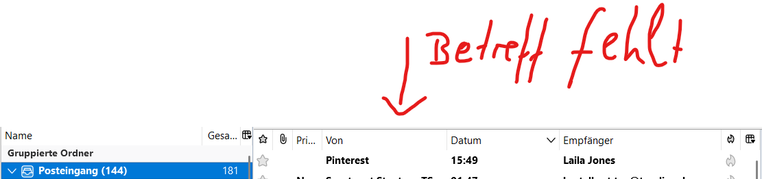 Wie der Betreff verschwinden konnte, bleibt rätselhaft. Wie anfangs geschildert, habe ich ja nichts verändert, nur neben dem PC gesessen und von Zeit zu Zeit Mails gecheckt als mir auffiel, dass der Posteingang verändert aussieht. Dachte an Fehler durch Update, Komprimierung o.ä....