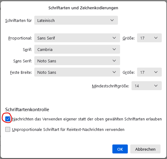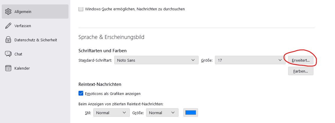 In den Einstellungen -> Allgemein -> Sprache & Erscheinungsbild. Dort bei den Schriftarten und Farben ganz rechts auf "Erweitert" und unten die Option "Nachrichten das Verwenden eigener statt der oben gewählten Schriftarten erlauben auswählen -> Fertig! Die Symbole von Google werden dadurch wieder alle so geladen, wie sie sollen ![]()