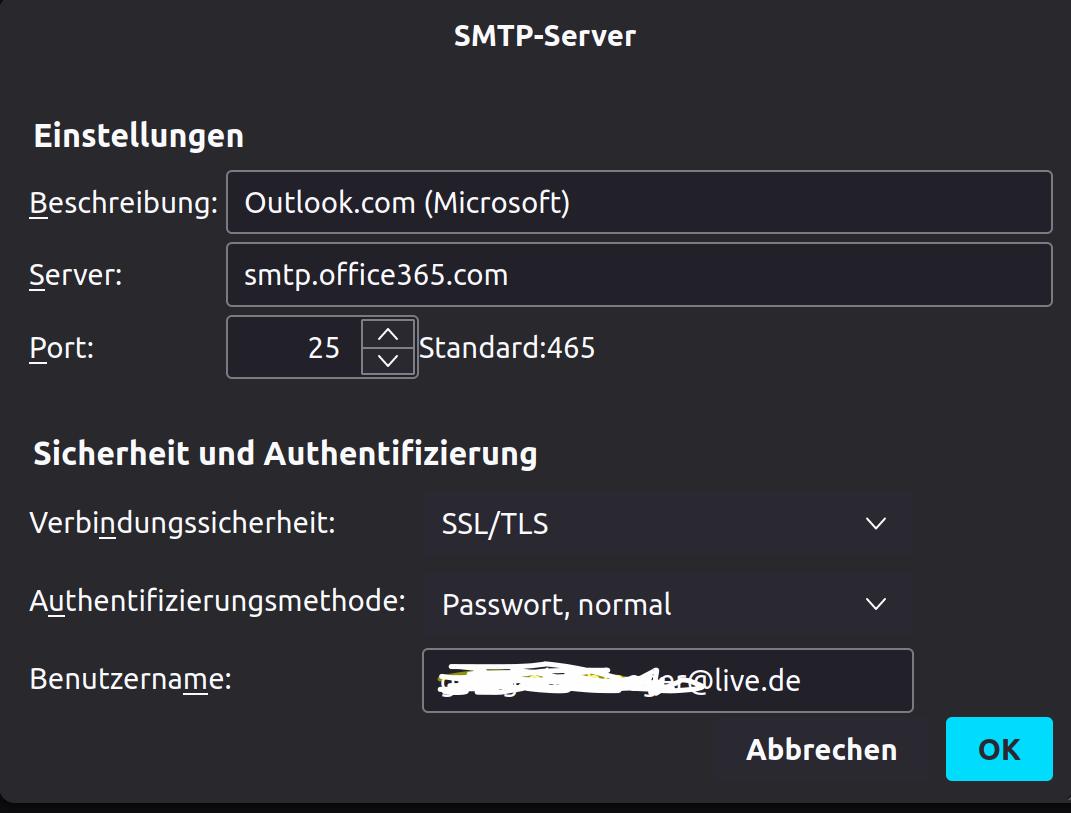 Ich habe nach Infoś aus dem Netzt mein @live.de Konto in Thunbird eingerichtet. Dachte erst, alles ist ok. Hatte App-Kennwort genutzt, nur so klappte es. Jetzt stelle ich leider fest, ich kann Mails empfangen, aber nichts versenden.