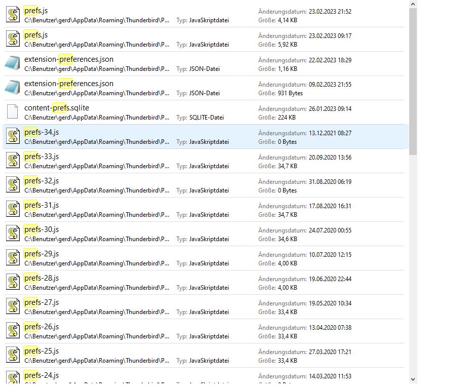 Ich nenne den aktuallen prefs um, zB in prefs_neu und prefs34 um in prefs.js (wobei dieser 0 KB hat, also leer ist ...)!? Finde ich unter content -prefs evtl noch andere, weil prefs33 ist von 2020...