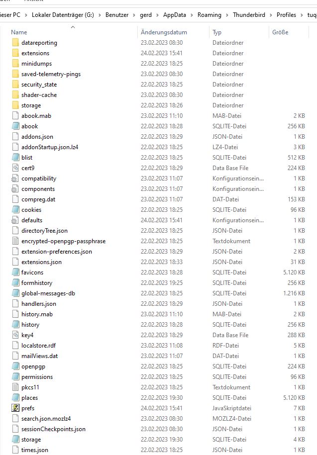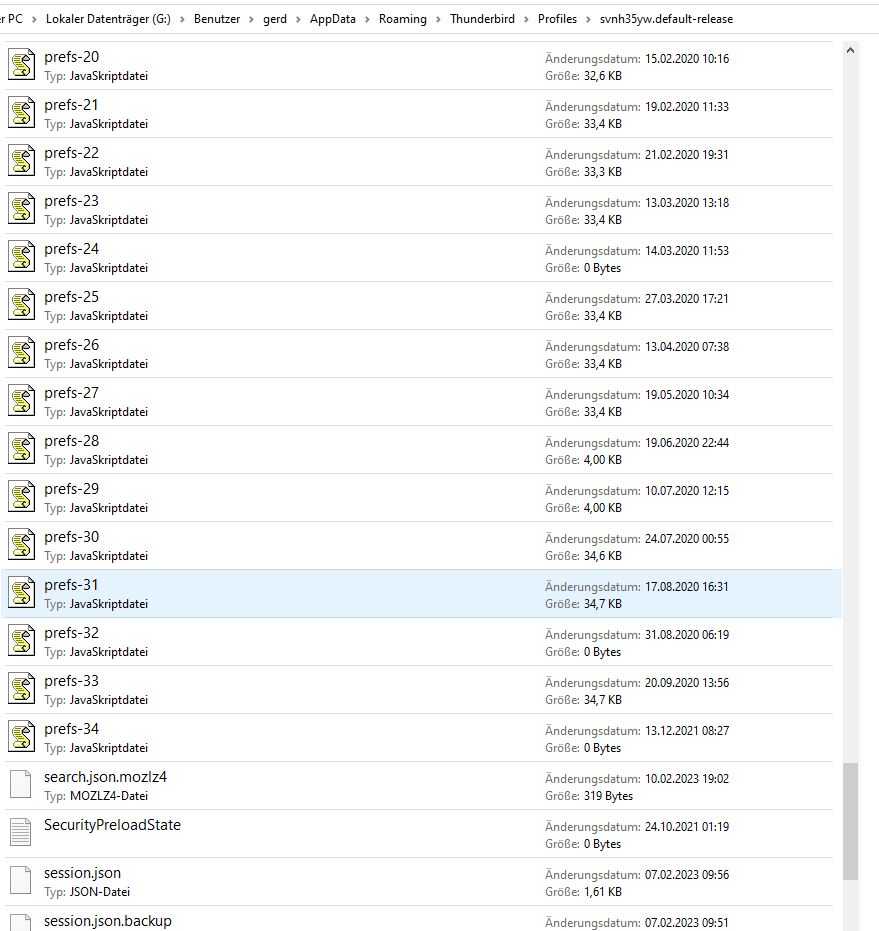 Hallo, war nicht viel online die Woche. Ihr schreibt "Mit hoher Wahrscheinlichkeit sind keine Daten gelöscht, sondern die Datei pref.js beschädigt. Stelle sie bei beendetem TB aus einer nicht allzu alten Sicherung wieder her." Ich wusste nicht, dass man da Sicherungen erstellen muss, oder machen die sich automatisch? Komprimiert habe ich immer. Und das Problem der selbstlöschenden Emails kann nicht an den Einstellungen liegen, denn sie sind bei allen meinen Emailkonten die unter thunderbird laufen die gleichen, aber bei manchen löschten sich die Mails ... Danke!!