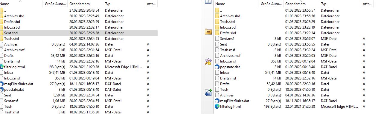 Nochmal zu der großen Datei: Die eine Datei Sent hat ca. 9 GB, die beinhaltet aber doch alle gesendeten Mails, nehme ich an. In TB selbst im Ordner "Gesendet" gibt es ganz viele Unterordner (ca. 50). Ich gehe mal davon aus, dass da keiner größer als 1 GB ist, aber an der Größe der Datei Sent selbst ändert das nichts. Aber das Problem ist also dadurch doch nicht ganz so groß? Oben wurde ein Import/Export-Tool erwähnt als Add-On, ich werde mir das mal anschauen, so wie ich verstanden habe, kann ich dann ja alles lokal außerhalb des TB-Profils speichern.