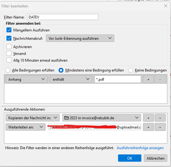 Thunderbird Regel für Datei Anhang PDF Remo86 20. Februar 2023 um 09:54 Hallo,wie kann ich es umsetzen das ich eine Regel für Datei Anhänge erfolgreich umsetzen kann?