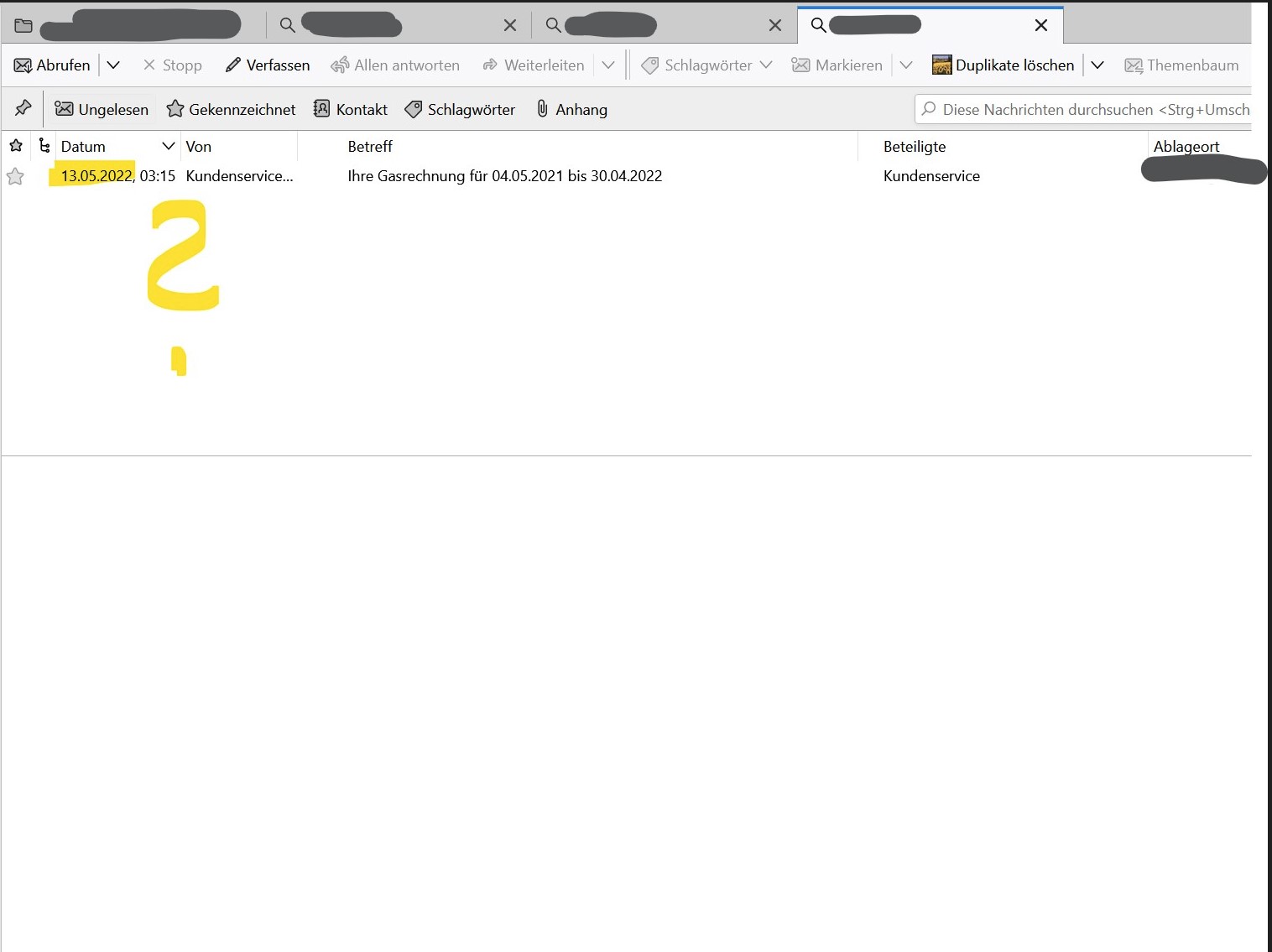 Jedenfalls! Beim Versuch, die Probleme einzukreisen und festzustellen, ob Mails einfach weg sind oder nur irgendwo anders gelandet (versehentliches Verschieben oder so?), schlägt dann Problem 4 zu - die defekte Suche.
