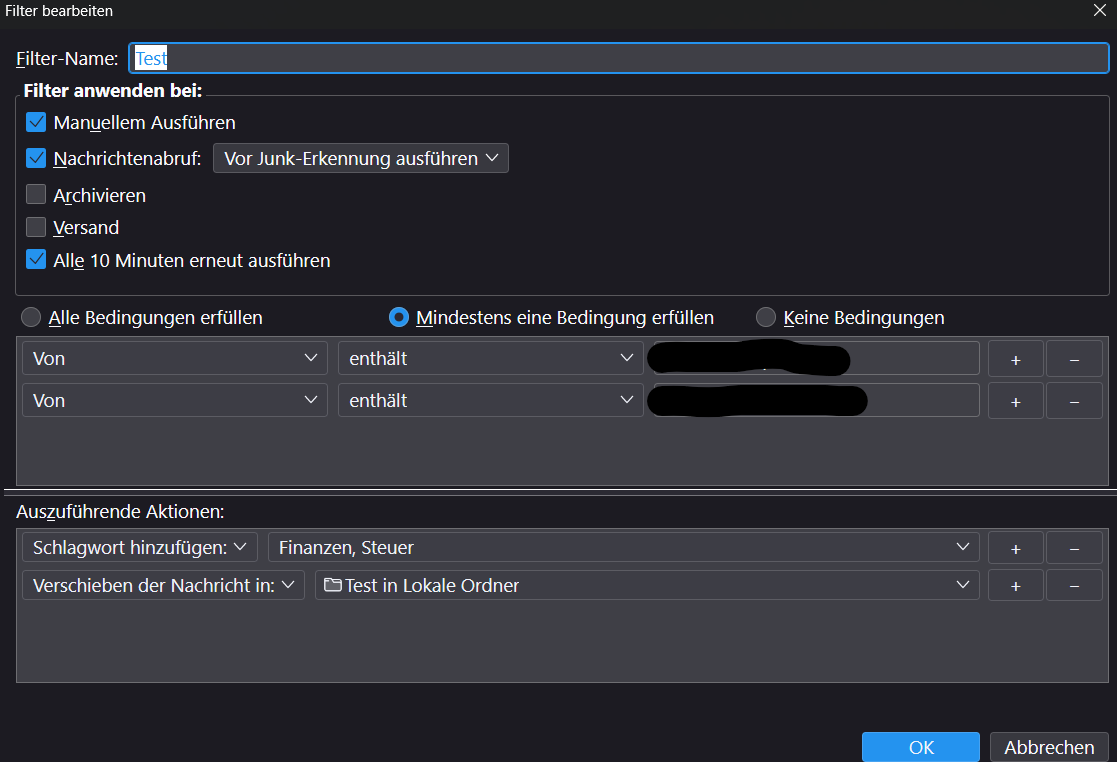 Hier die Filtereinstellungen. Mailadressen sind natürlich verschieden.