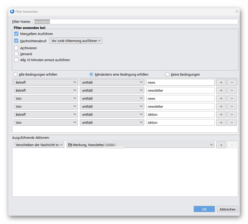 ich habe einen Filter angelegt der alle Mails im Posteingang mit den Stichwörtern "news", "newsletter" in einen entsprechenden Ordner "Newsletter" verschiebt.