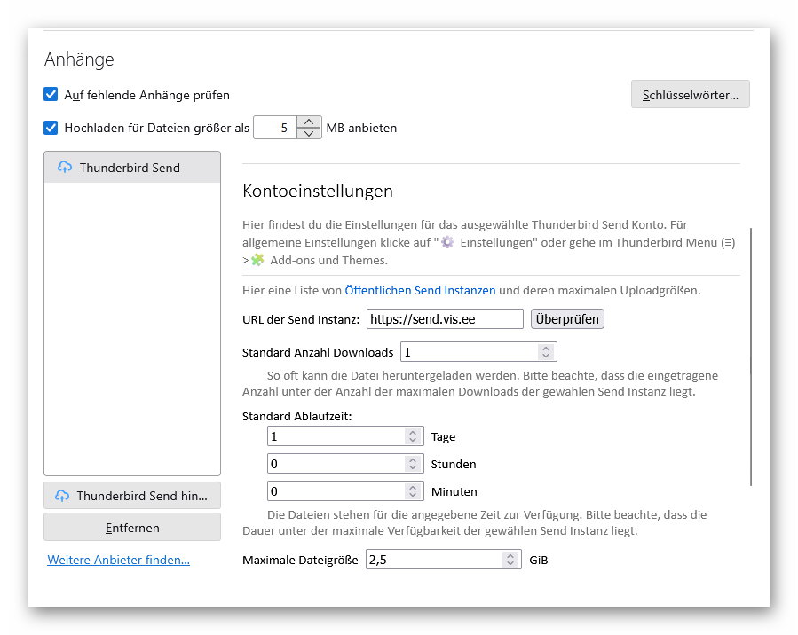 ich habe bis jetzt nur kleine Dateien per email versendet. Jetzt habe ich eine größere und beim Anhang einfügen in TB kommt die Meldung das besser ein FileLink genutzt wird. So bin ich auf hinzufügen und jetzt ist in TB unter Erweiterungen zu finden:
