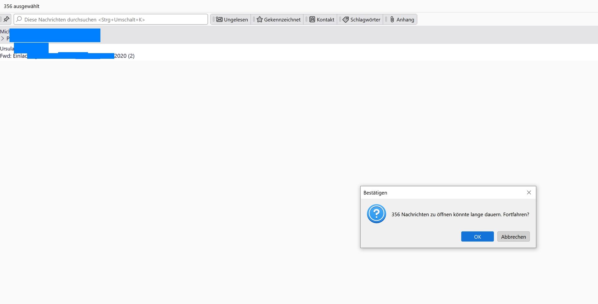 Ich suche eine bestimmte E-Mail, gebe in die Suchfunktion den Namen des Absenders ein und erhalte sofort eine Liste mit von ihm geschickten Mails. Ganz oben dabei steht die E-Mail, die ich suche. Klicke ich die an, kommt die Meldung: „339 Nachrichten zu öffnen könnte lange dauern. Fortfahren?“An die angeklickte Mail komme ich so nicht ran. - Was kann ich tun?