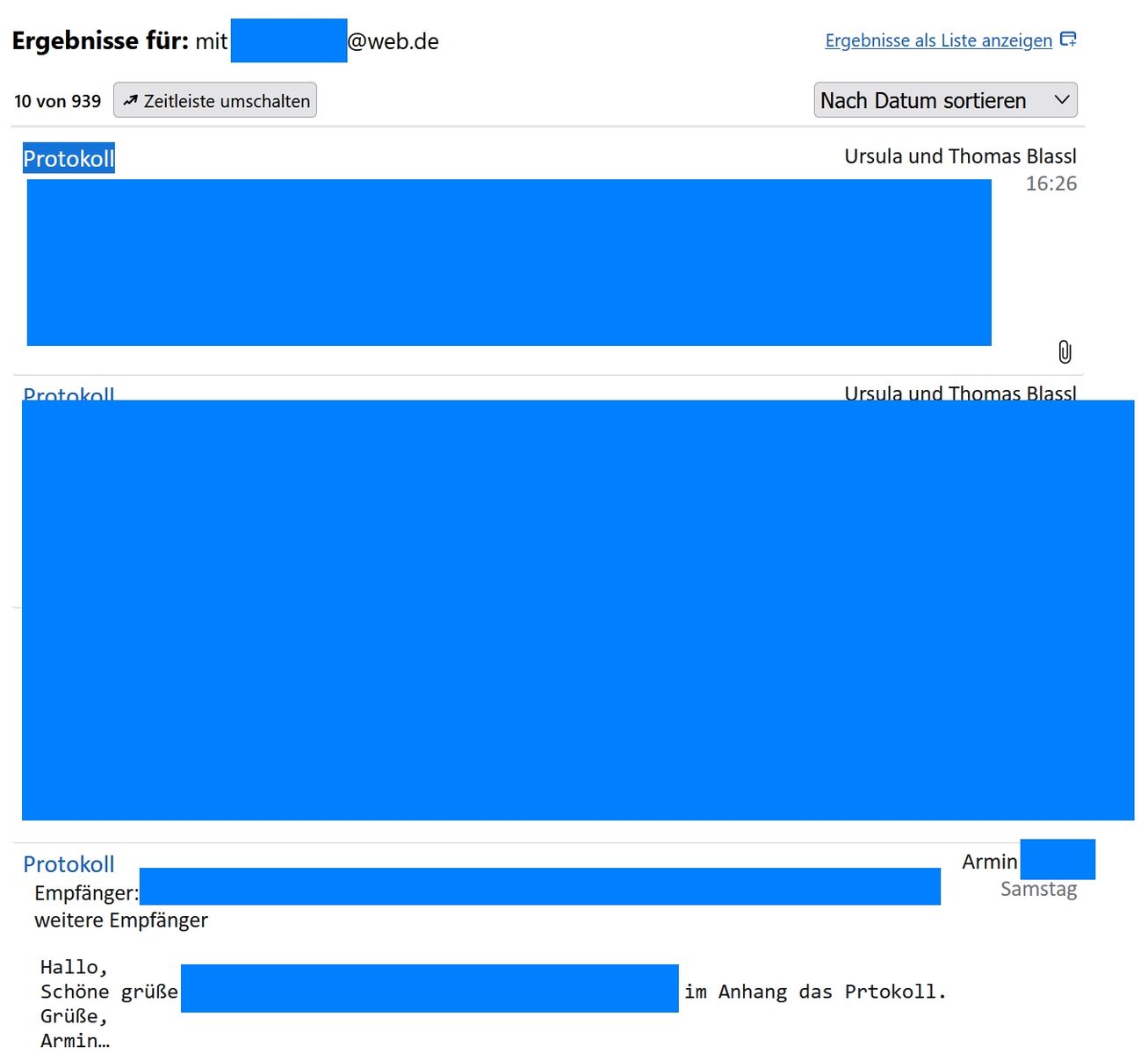 Ich habe eine allgemeine Suche nach einem Absendernamen gestartet, um eine E-Mail mit einem bestimmten Protokoll im Anhang zu finden. Danach habe ich die Ergebnismeldung Bild1 erhalten. Da war auch die gesuchte E-Mail dabei. Ich habe dann die entsprechende Mail angeklickt und Bild 2 bekommen. Das war für mich schon etwas rätselhaft. Dann habe ich im Bild 2 auf den ersten Eintrag geklickt und daraufhin die tolle Meldung mit den 356 Nachrichten bekommen. ???