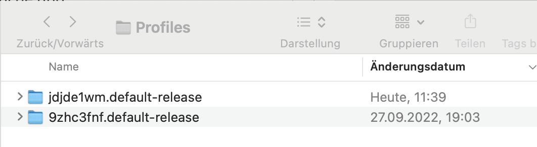 Der Ordner user/Library hat das Änderungsdatum 05.04.2024 (warum auch immer). Der darin befindliche Ordner "Thunderbird" hat das Änderungsdatum 27.09.2022. der darin enthaltende Ordner "Profiles" und das "profiles.ini" haben das Änderungsdatum 27.09.2022. Das Profil "jdjde1wm.default-release" hat das Änderungsdatum: Heute.