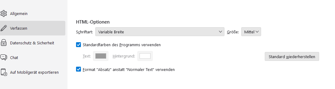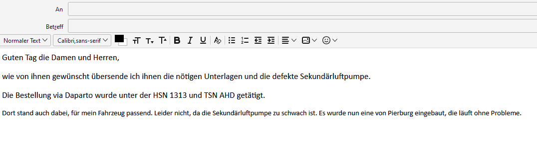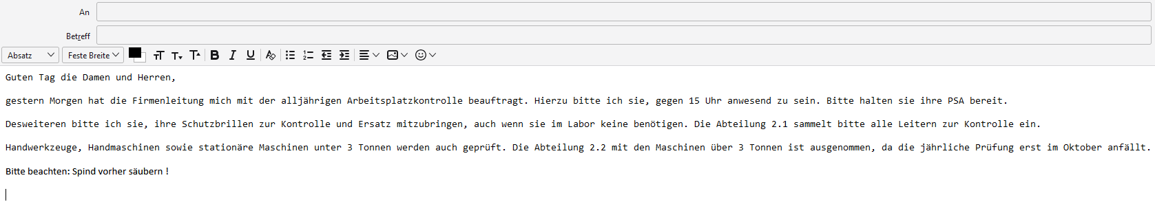 Nun, das war wohl so.....Ich öffne ganz normal via Doppelklick Thunderbird. Dann klicke ich auf eines meiner E-Mail Programme, wobei es völlig egal ist welches, klicke oben auf Neue Nachricht verfassen und fülle oben die beiden Zeilen aus. Bis hier steht oben, Absatz, daneben Varialble Breite.
