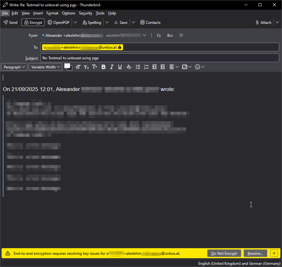 Also sagen wir mal ich antworte an eine Mail die über den Server geschickt wurde, die username+name+domain@unbox.at heißt, der PGP-Key muss aber postmaster@unbox.at sein. Das wird von Thunderbird-PGP anscheinend nicht zugelassen.