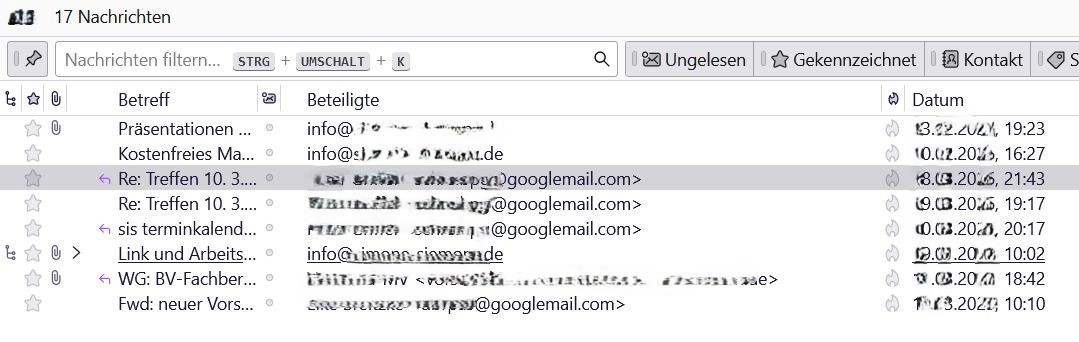 Mein Problem ist, dass in der lokalen Dateiablage (C:\Users\ustsc\AppData\Roaming\Thunderbird\Profiles\52xlkl0m.default\Mail) zwar alle dort abgelegten Dateien gezählt, aber nicht angezeigt werden. Im Screenshot ist ein Ordner mit 17 Dateien zu sehen von denen nur 8 angezeigt werden. Wenn ich auf das Icon für ungelesene Dateien klicke, erscheint eine weitere, noch ungelesene Datei. Ich habe, um grob zu testen, ob die Speicherkapazität überschritten ist, einen Unterordner angelegt und eine Datei dort abgelegt. Diese wurde mir problemlos angezeigt. In meiner lokalen Ablage befinden sich 3,22 GB in 538 Dateien.