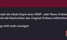 Meine Ordnerstruktur hatte einen Ordner, der direkt unter dem Konto angelegt (wenn so will auf einer Ebene mit dem Posteingang). Dieser war seltsamerweise auch im Gegensatz zu allen anderen Ordnern kursiv geschrieben. Unter diesem Ordner waren 5 weitere Hauptordner angelegt, jeweils wieder mit massiv Unterordnern.