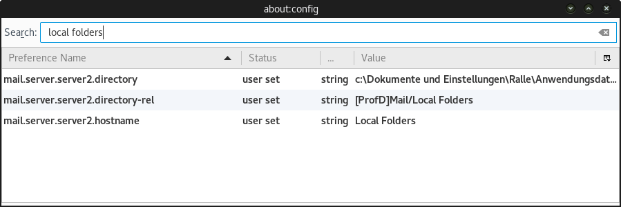 Du kannst dennoch die preference "mail.server.server2.directory" zurücksetzen über einen Rechtsklick > Zurücksetzen. Vorher würde ich allerdings eine Sicherungskopie der Datei "prefs.js" machen.